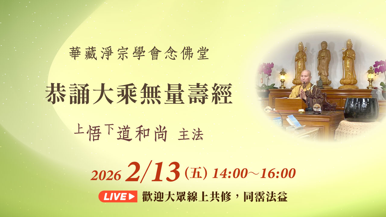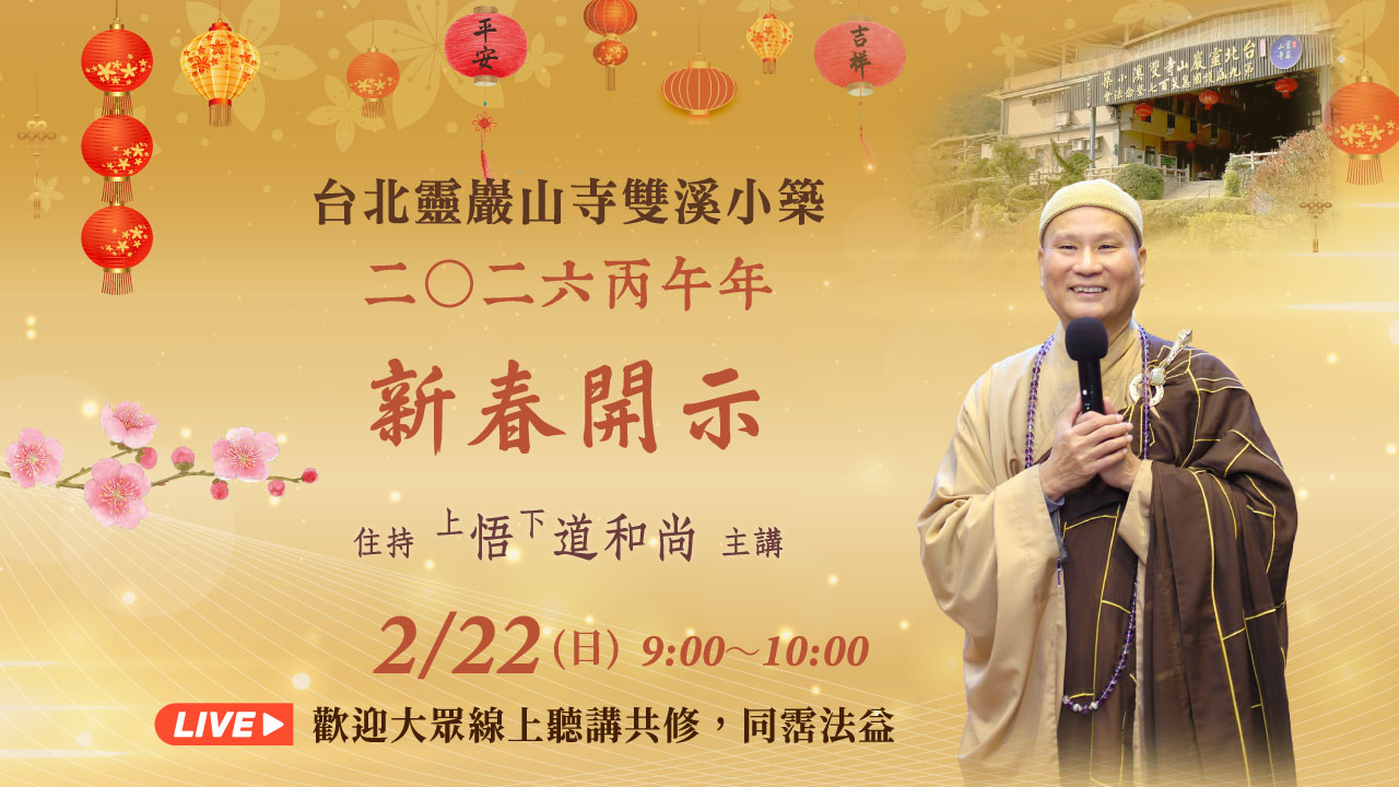 2月22日 上午9:00~10:00 悟道和尚雙溪小築2026丙午年新春開示,網路直播,歡迎線上聽講。相關資訊敬請參閱…