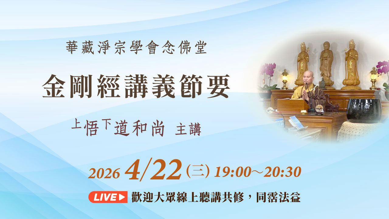 4/22(三)晚上7:00華藏念佛堂恭請悟道和尚主講《金剛經講義節要》,網路直播,歡迎大家線上聽講,同霑法益。相關資訊敬請參閱…