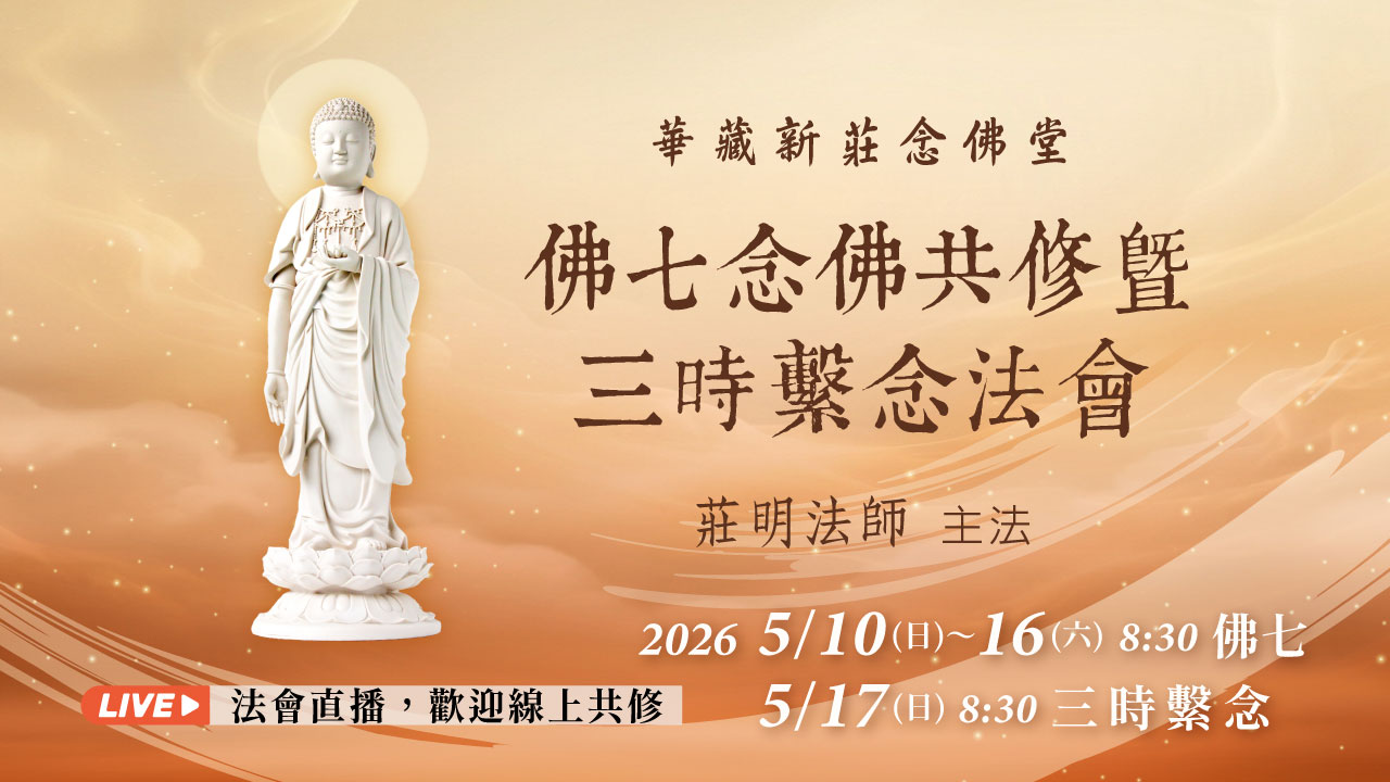 5月10~16日佛七念佛共修,實習主七 莊明法師;17日三時繫念法會,實習主法 莊霖法師,佛七及法會現場直播。歡迎線上同步共修。相關資訊請參閱…