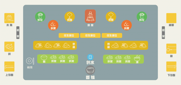 佛像、香爐、往生蓮位、供水、供燈、供花、供果、供菜、供品。