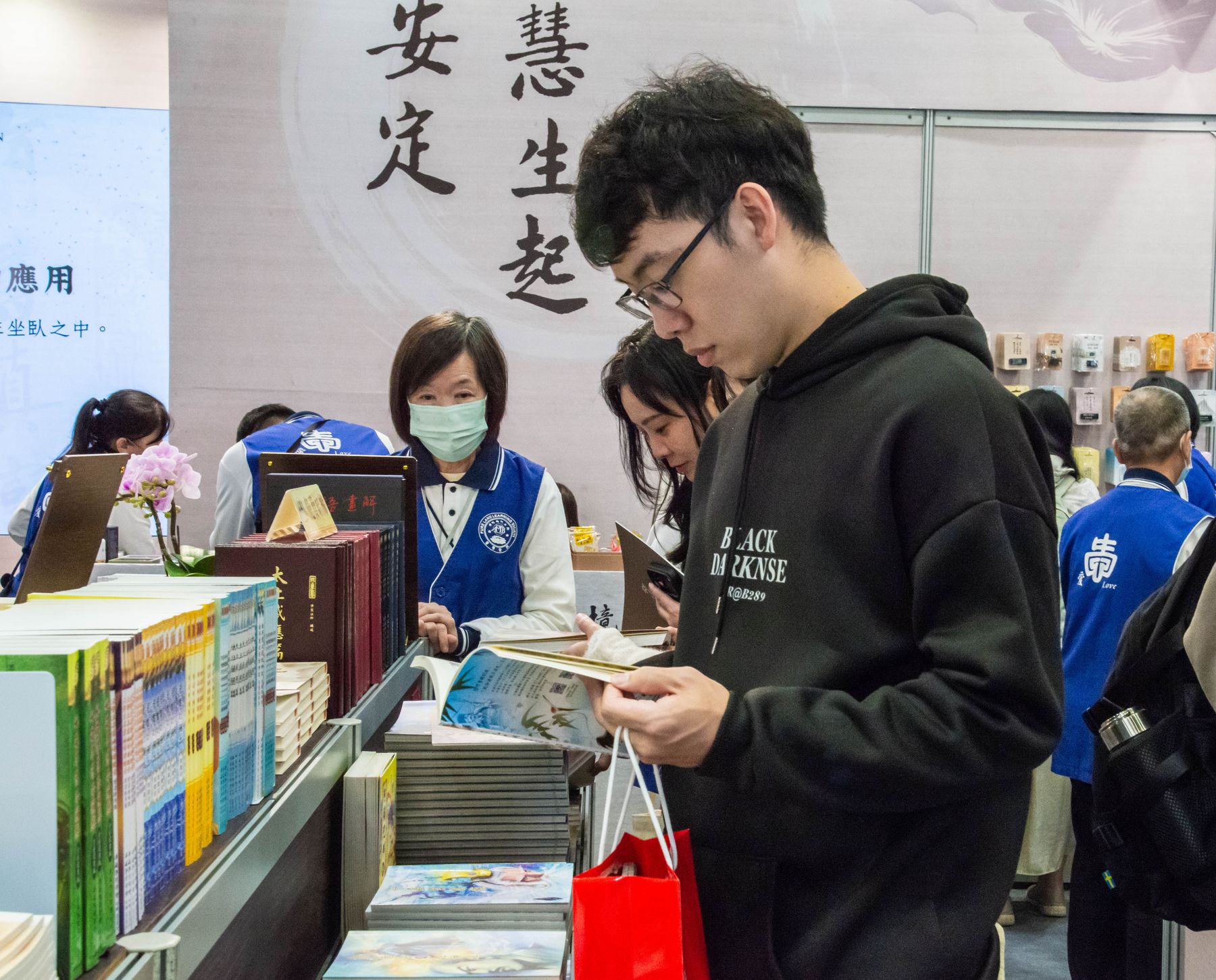 2/4(三)台北國際書展華藏展區,現場人潮絡繹不絕,氣氛歡喜且溫暖,上悟下道法師與多位貴賓親臨會場,共同見證法教的傳承與感動。