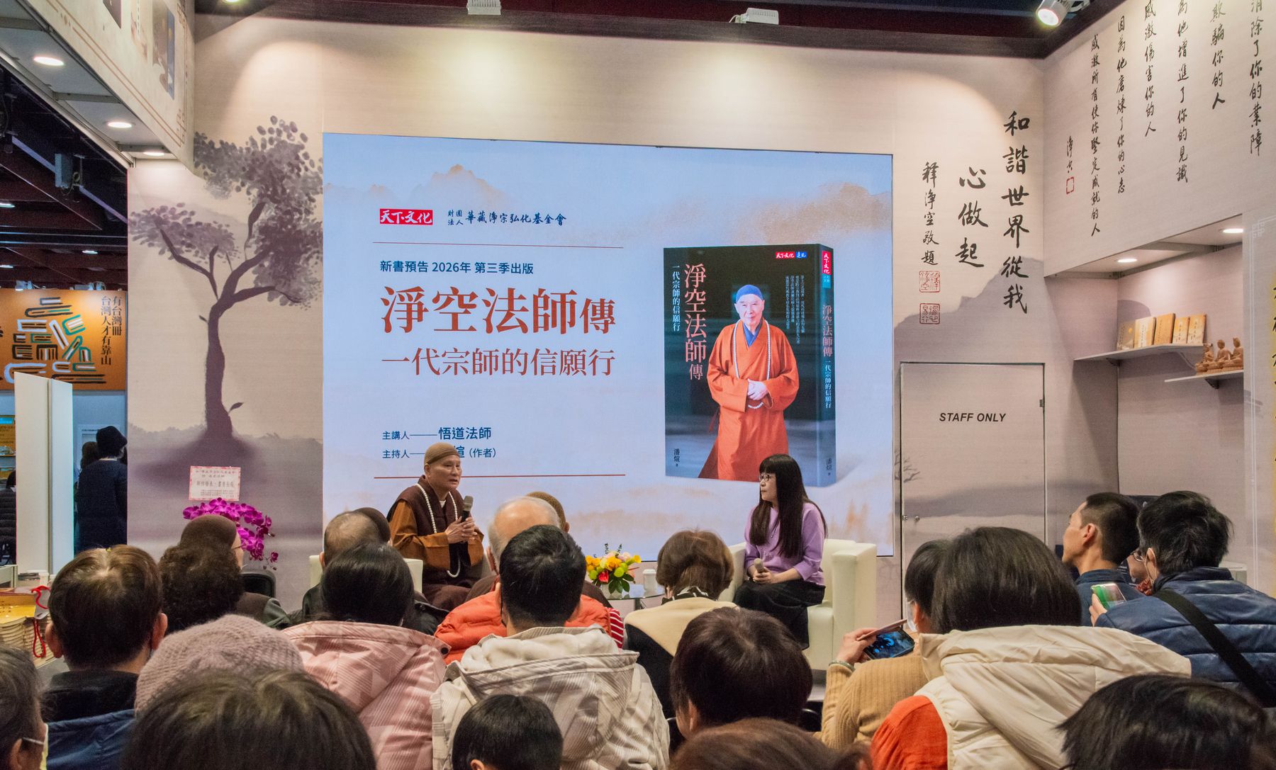 首先登場的是天下文化新書預告《淨空法師傳——一代宗師的信願行》,由悟道法師與作者潘煊對談分享,從編寫緣起、資料梳理到精神主軸層層鋪陳,帶領大眾回顧老法師一生弘法利生的信、願、行實踐。透過深入對談,不僅呈現一代宗師的行誼風範,也讓讀者看見時代背景下堅定道心的力量,現場多次響起掌聲。