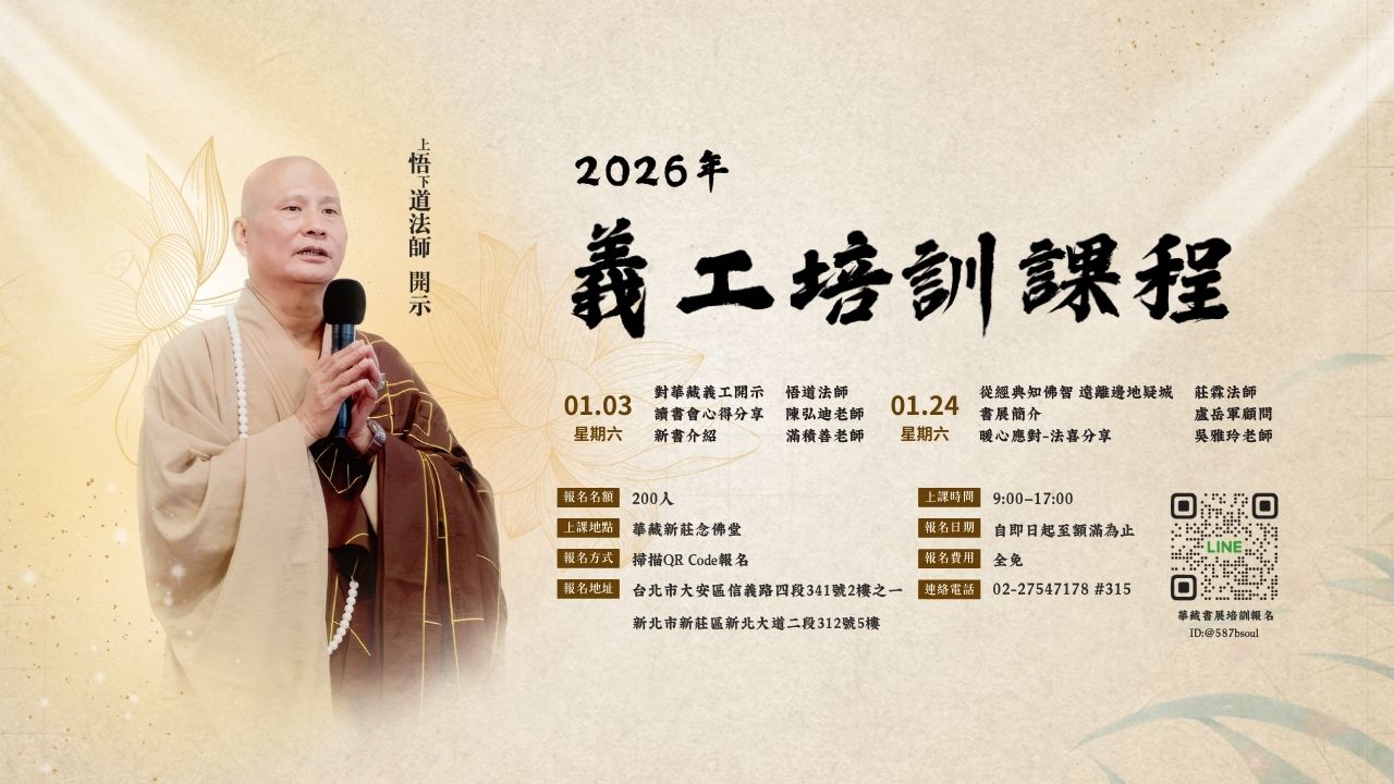 1月3日舉辦國際書展義工培訓課程恭請 上悟下道法師親臨開示,網路直播,竭誠歡迎線上共修,同霑法益。相關資訊敬請參閱…