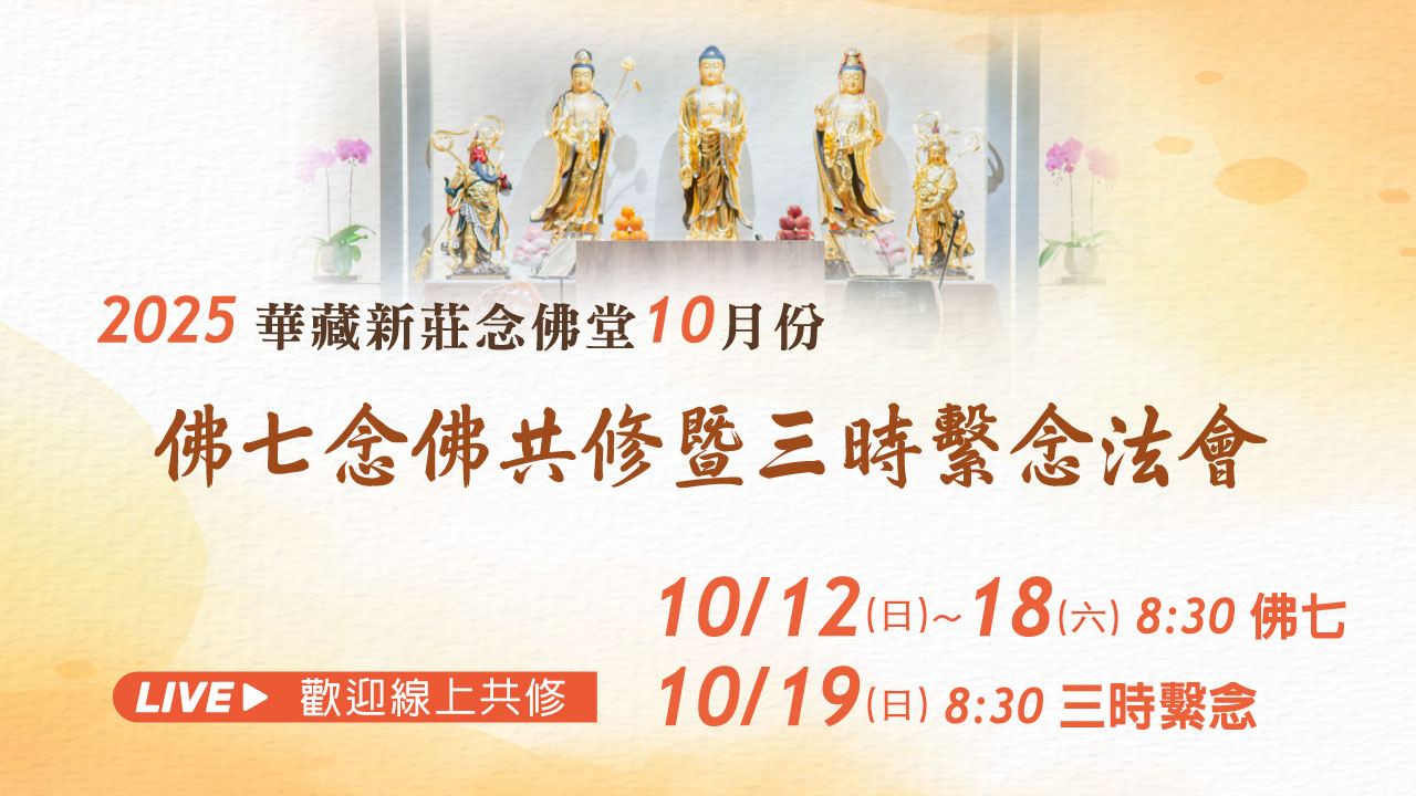 10月12~18日佛七念佛共修,實習主七 莊明法師;19日三時繫念法會,實習主法 莊霖法師,佛七及法會網路直播。歡迎網路線上同步共修。相關資訊請參閱…