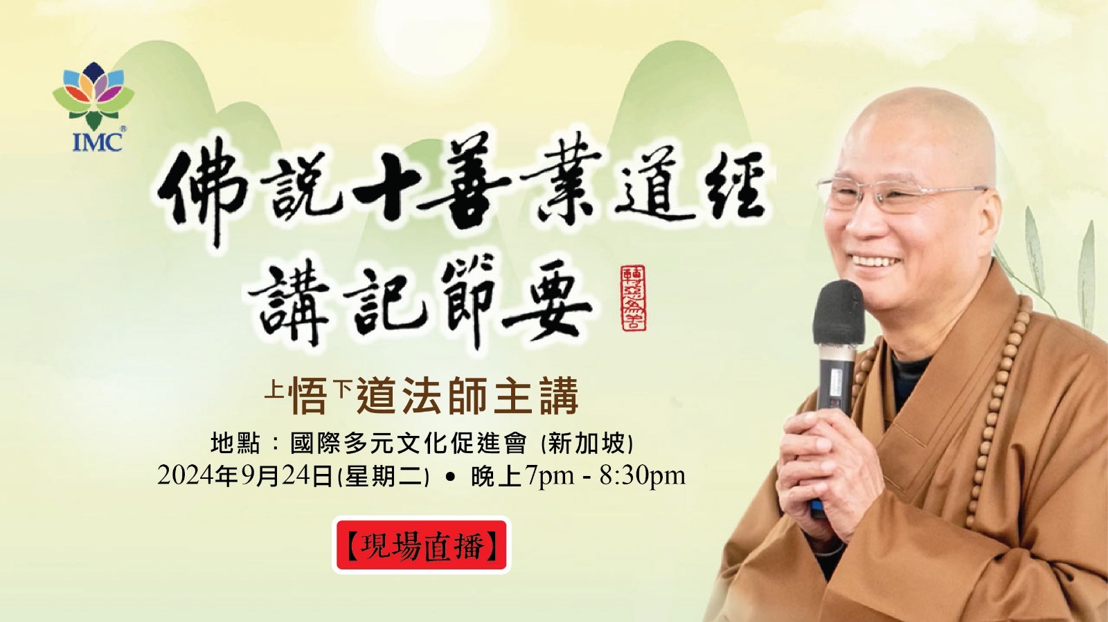 9月24日19:00新加坡國際多元文化促進會禮請悟道法師續講《佛說十善業道經》講記節要,網路直播,歡迎大家線上聽講。
