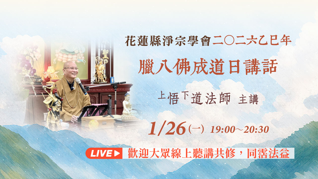 1月26日 晚上7:00~8:30 悟道法師花蓮縣淨宗學會2026乙巳年臘八佛成道日 講話,網路直播,歡迎線上聽講。相關資訊敬請參閱…