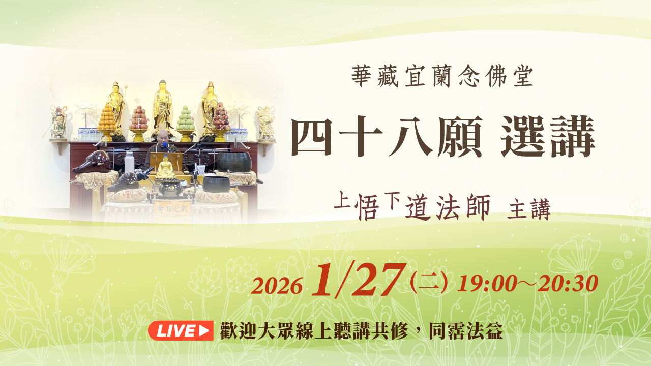 1/27 晚上7:00~8:30 悟道法師華藏淨宗學會宜蘭念佛堂宣講《四十八願選講》,網路直播,歡迎線上聽講,相關資訊敬請參閱…
