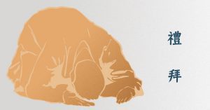 2.將頂禮時,右手先下,左手合掌,腰幹徐徐彎下,同時兩腿屈下、令兩膝靠著拜墊邊。