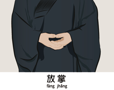 放掌時,手結彌陀印,即兩掌仰疊,左手在上、右手在下,兩大拇指指尖相對;手臂舉肘不宜抬的太高,亦不宜垂落。