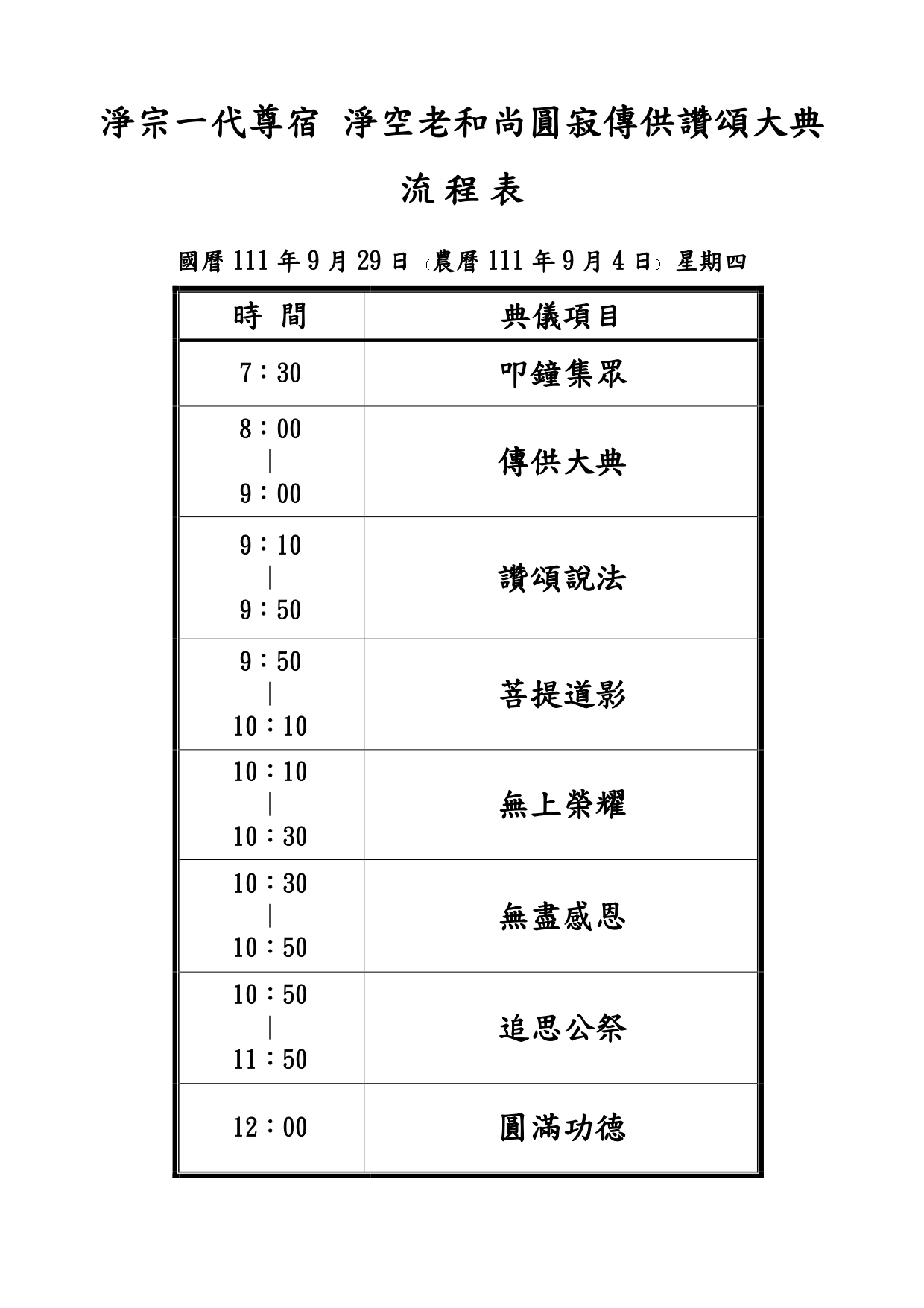 07:30 叩鐘集眾08:00-09:00 傳供大典09:10-09:50 讚頌說法09:50-10:10 菩提道影10:10-10:30 無上榮耀10:30-10:50 無盡感恩10:50-11:50 追思公祭12:00 圓滿功德時程表:圖檔 PDF檔