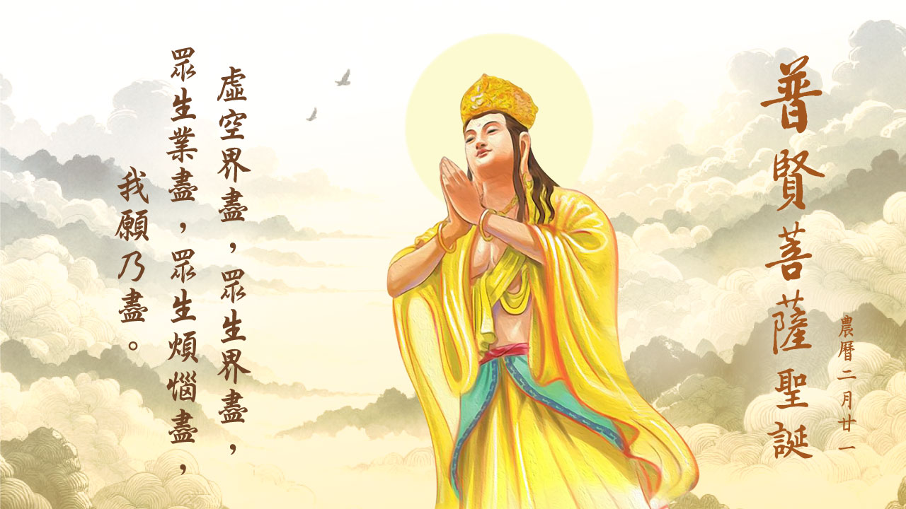 農曆二月二十一日是普賢菩薩聖誕日。普賢菩薩在《華嚴經》中代表行門,與代表解門的文殊菩薩相輔相成。解門是智慧,行門是實踐。大智文殊師利,大行普賢菩薩,二者缺一不可。