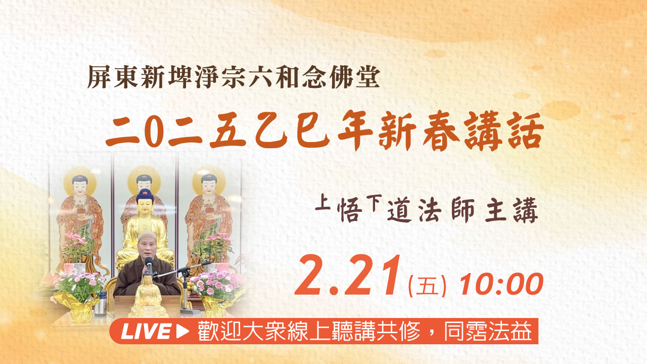 2/21 上午10:00~11:30 悟道法師屏東新埤淨宗六和念佛堂2025乙巳年新春講話,網路直播,歡迎線上聽講。相關資訊敬請參閱…
